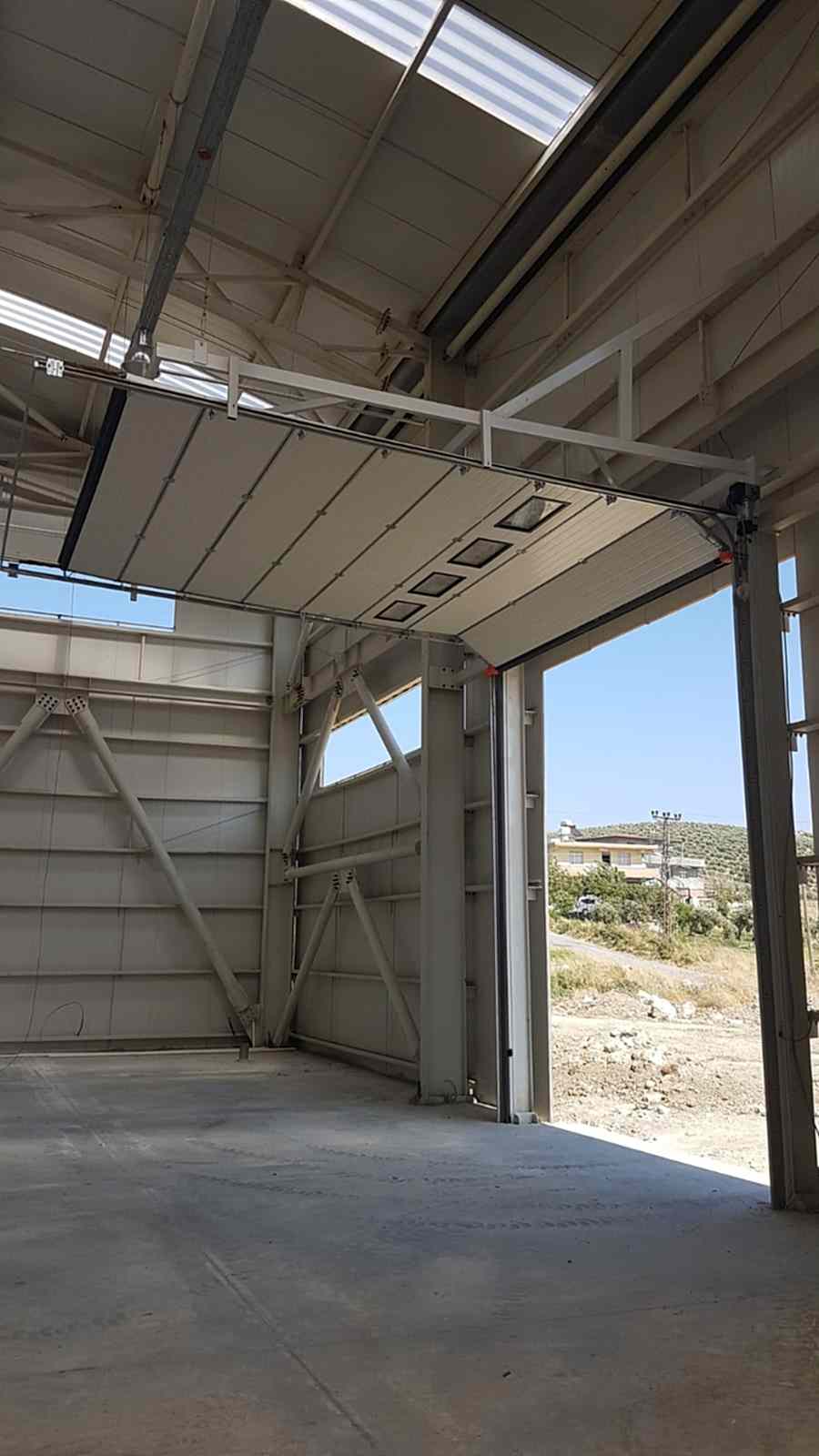 - Kapı boyutu 6 metre ve üzerinde ise, panel birleşimlerinde çarpmalara ve rüzgar yüklerine karşı mukavemet arttırma amaçlı; panel birleşimlerinde destek sacları, çift yan menteşeler ve uzun milli tekerler olmalıdır.